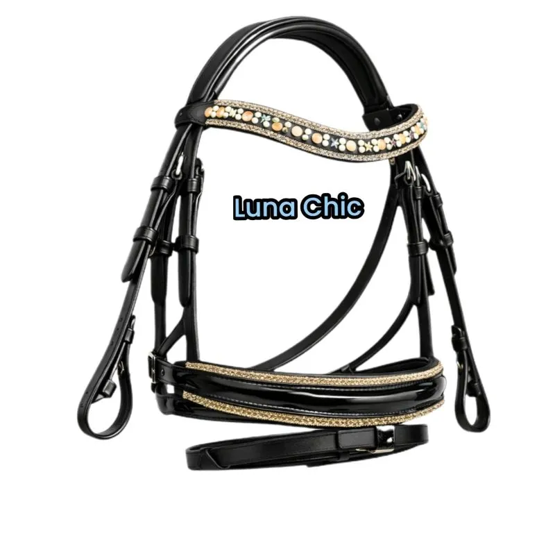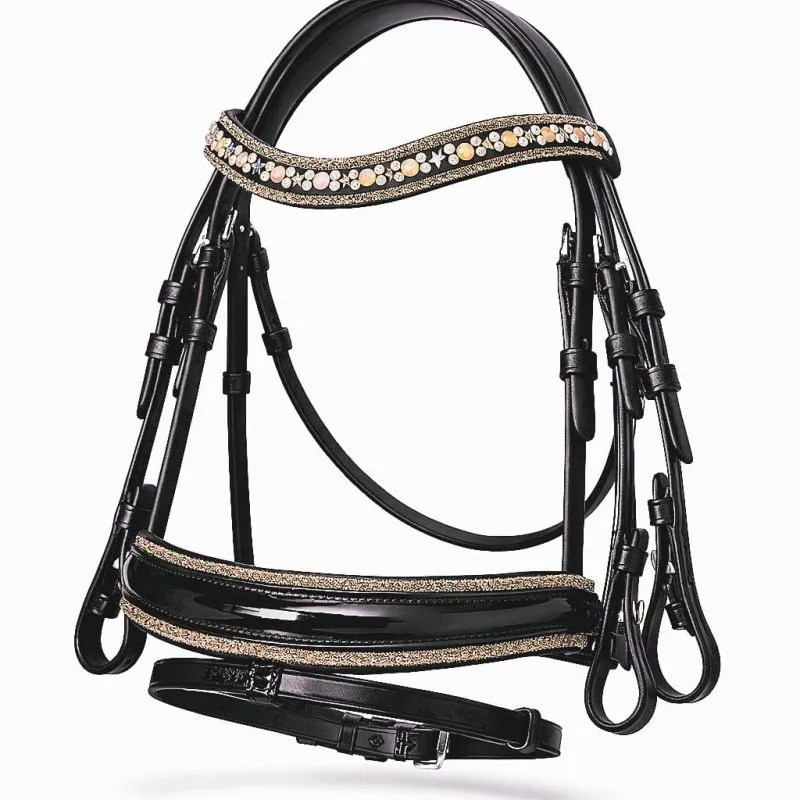 Diese hochwertige Ledertrense vereint ein ergonomisches Kopfstück mit einem funkelnden Lacknasenriemen und passendem Glitzer-Stirnriemen – perfekt als Trense für kleine Ponys.