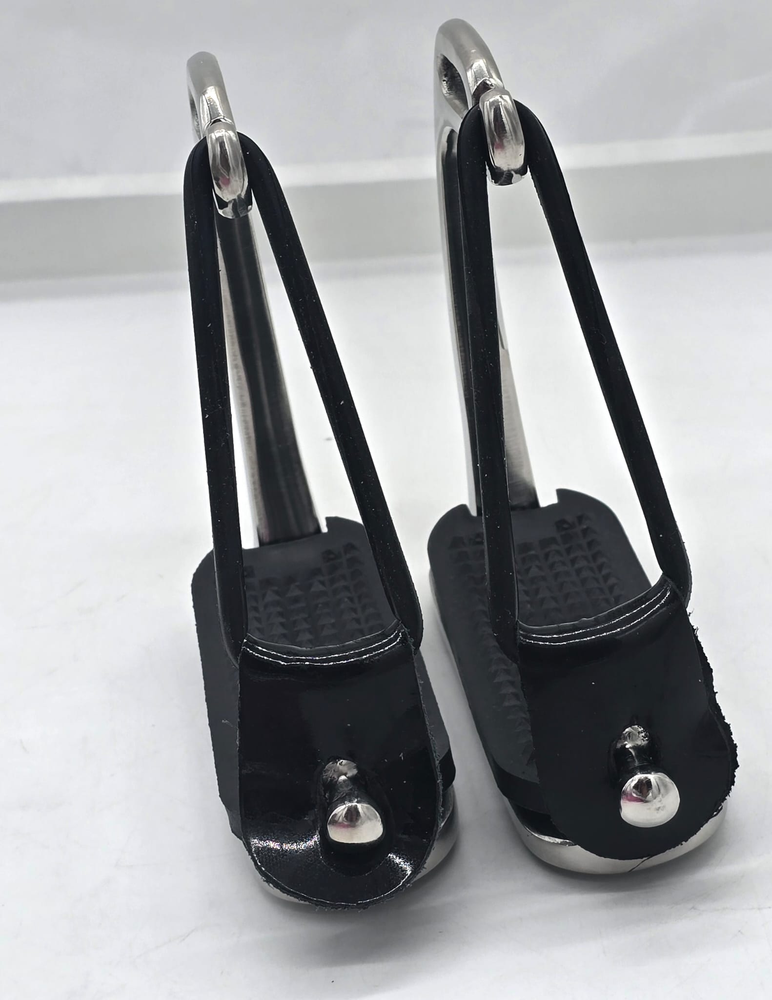 🔹 Material: Robuste Metallbügel mit rutschfester Trittfläche aus Gummi 🔹 Sicherheitsfunktion: Gummiring mit Lederschlaufe und Knopfverschluss – einfach austauschbar 🔹 Trittfläche: