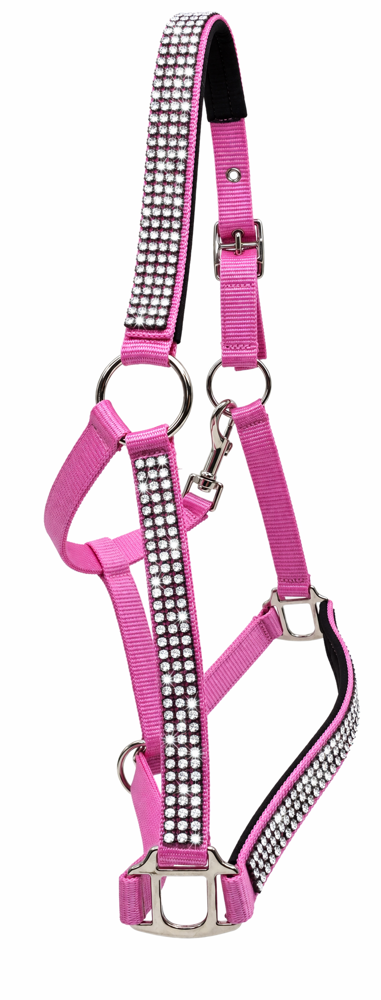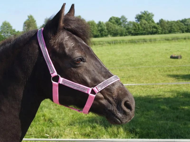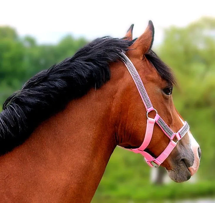 Hochwertiges Nylonhalfter in kräftigem Rosa mit durchgehender Glitzerbordüre für einen eleganten Look.