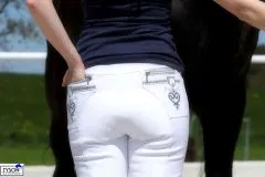 Vollbesatz Reithose mit Glitzer an beiden Gesäßtaschen. + je einen YKK Zipper 2 Einschubtaschen, vorne. YKK Zipper + Sicherheitsverschluß am Bund. An den Beinenden Schlupfenden. | |||||
