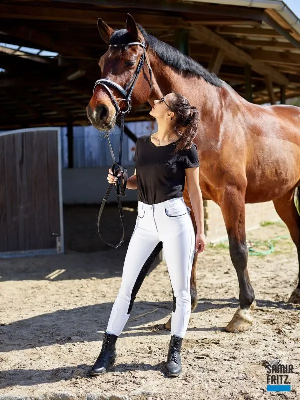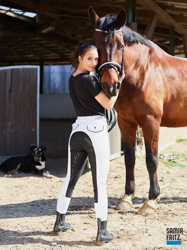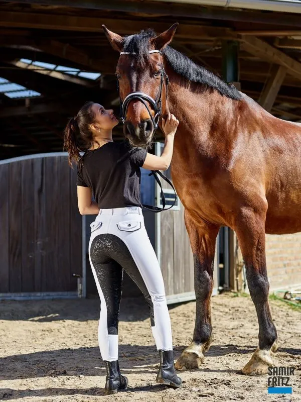 Turnier Vollbesatz Silicon Grip Black n White | | Turnierreithose B + W - Vollbesatz Silicon Grip + Schlupf . Normalbund - mit Gürtelschlaufen. YKK Zipper | Stoff : Weiß / Schwarz - auf dem Schwarz ist ein Vollbesatz aus Silicon Grip - dieser ist durchsichtig. | Elastisch, Anpassungsfähih und Formbeständig. | Gesäß : 2 Einschubtaschen mit Knopf . Schwarz abgesetzt. 2 Einschubtaschen vorne- ebenso Schwarz abgesetzt. Die Passform ist noch immer Top auch nach der X ´ten Wäsche. | Super Sitz. Kein unschönes Schlabbern an den Knien, besonders nicht nach dem reiten! | PFLEGEHINWEIS: 30 Grad Maschinenwäsche- links waschen | Schnell trocknend. Kein BEULEN. Auch nach dem waschen nicht!! | | | Material: | Stoff: Polyester 60 % , Viscose 33 %, 7 % Spandex - dadurch super elastisch. | Besatz: Silicon Grip- durchsichtig. Größen : 36 38 40 42 44 46 oder 48 | |