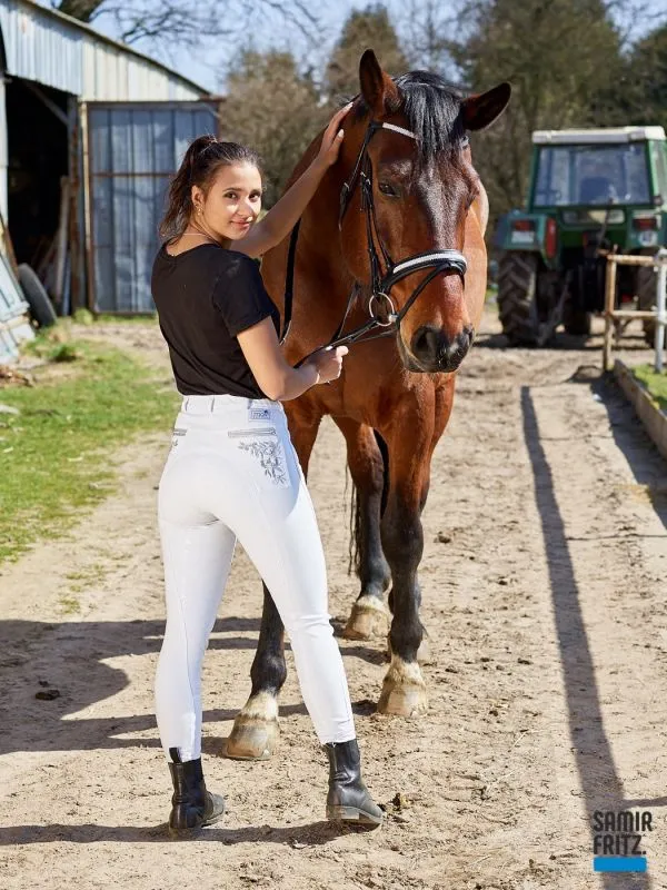 Turnier Vollbesatz Silicon Grip NINA - GRIP | | Turnierreithose Nina - Vollbesatz Silicon Grip + Schlupf | Der Besatz ist durchsichtig ! Eine Rein Weiße Turnierreithose. | Elastisch, Anpassungsfähih und Formbeständig. | Gesäß : 2 Einschubtaschen mit Zipper. Silber Farben Stickerei Die Passform ist noch immer Top auch nach der X ´ten Wäsche. | Super Sitz. Kein unschönes Schlabbern an den Knien, besonders nicht nach dem reiten! | PFLEGEHINWEIS: 30 Grad Maschinenwäsche ( Meine habe ich sogar bei 95 % gewaschen ) | Schnell trocknend. Kein BEULEN. Auch nach dem waschen nicht!! | | | Material: | Stoff: Polyester 60 % , Viscose 33 %, 7 % Spandex - dadurch super elastisch. | Besatz: Silicon Grip- durchsichtig. ( WEiß)