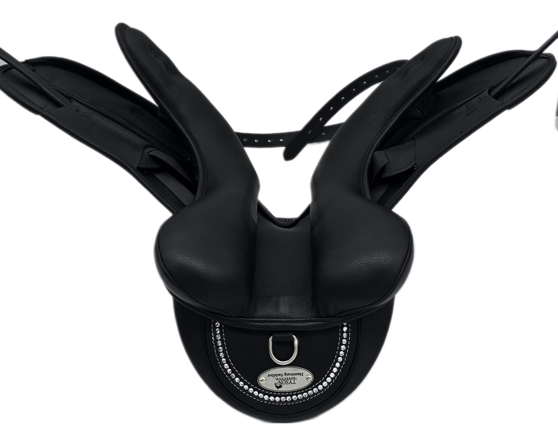 Inclusive 5 X Kopfeisen - Kinderleicht umzubauen! ( Kopfeisen 1 X verbaut) Der Sattel hat " richtige Kissen " Scheifriemenöse + D- Ringe zum befestigen von Hilfszügeln. Schwarzes WEICHES Rindsleder. Hinten am Sattel -Hinterzwisel / Efter : Glitzerbogen Unter dem Sattelblatt befinden sich 2 Gurtstrupfen je 2,5 cm breit. Sowie eine je eine kleine Kniepausche, diese ist verstellbar mittels Klett. ( Klettpauschen) Maße von unten = Auflagefläche : CIRCA Maße ! 14 Zoll = 35 cm Länge Sattelblatt ab Steigbügelhalterung ~ 28,5 cm Breite ~ 24 cm Mitgeliefert werden 5 Kopfeisen | |||||