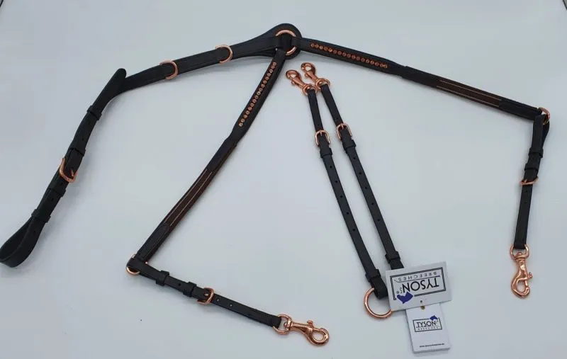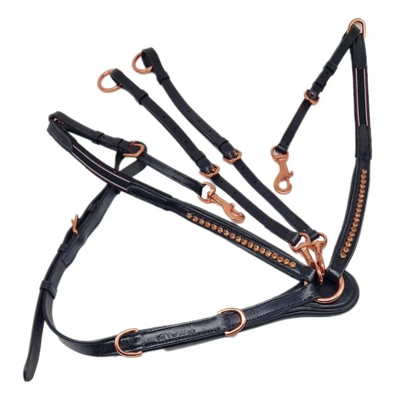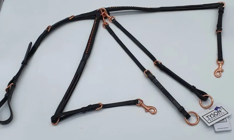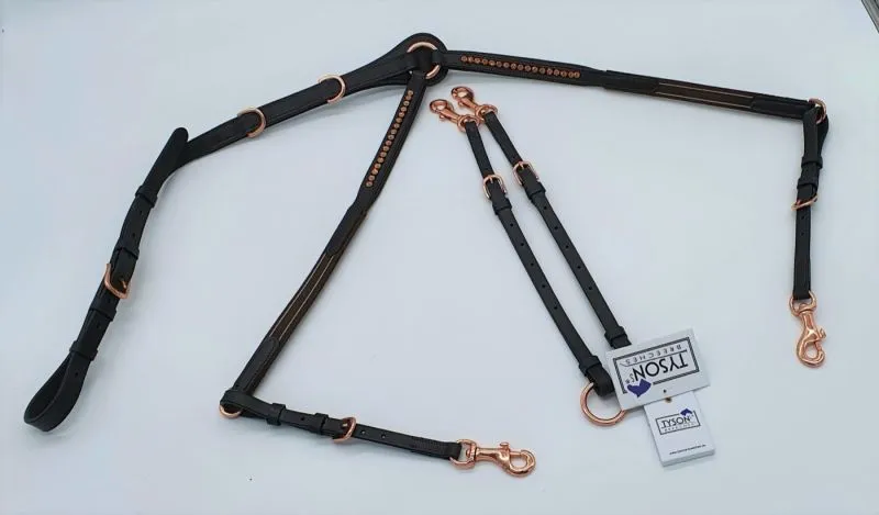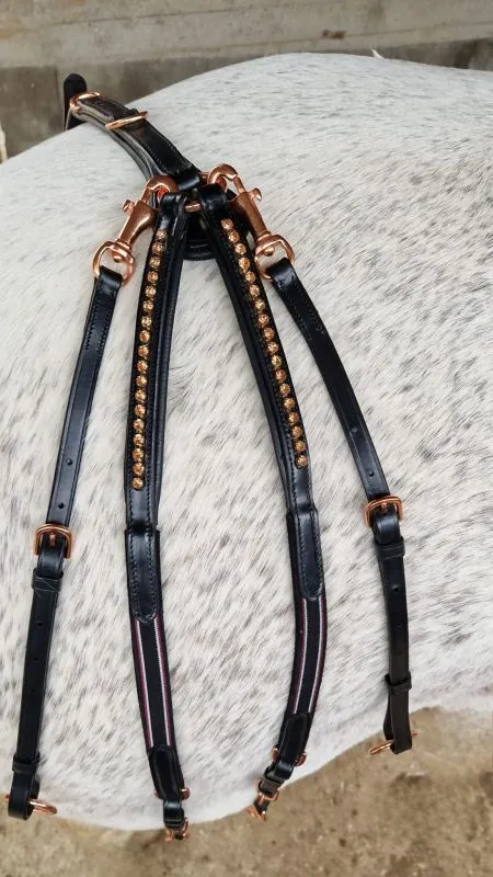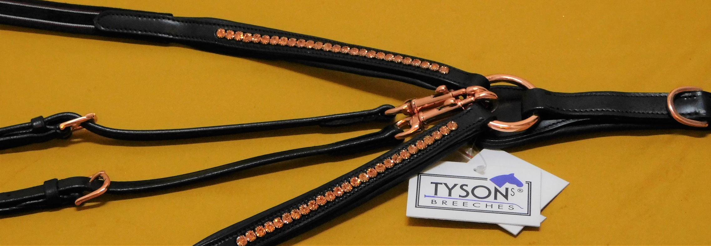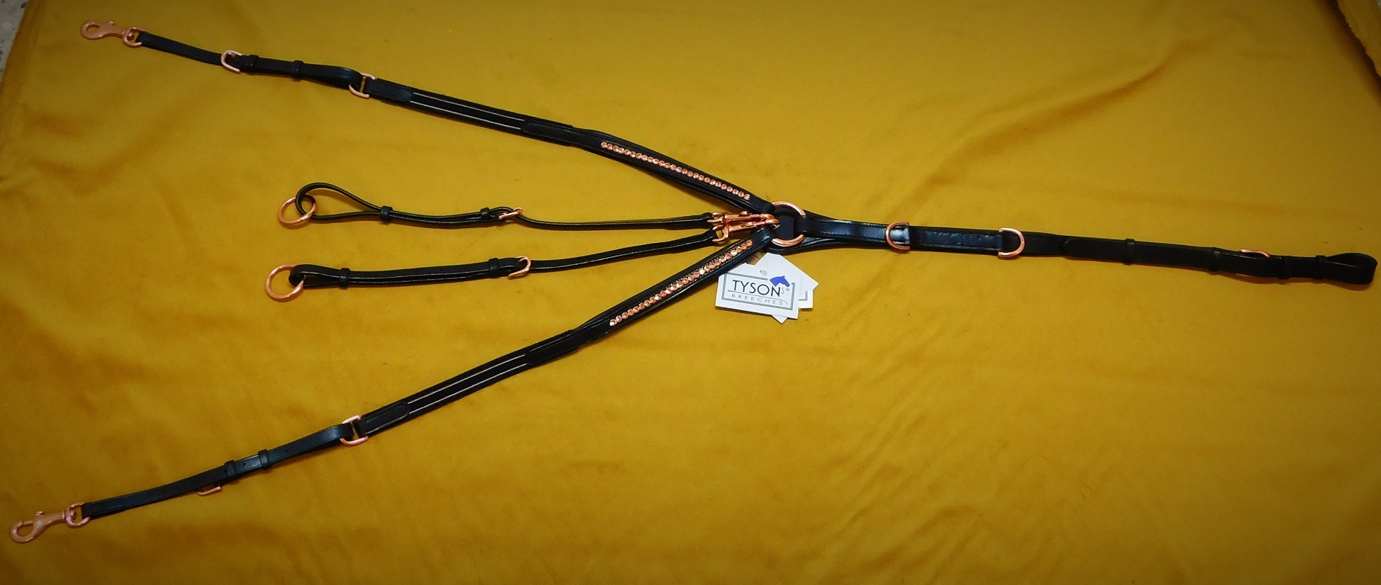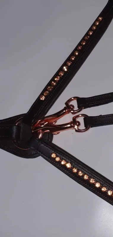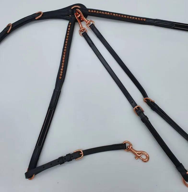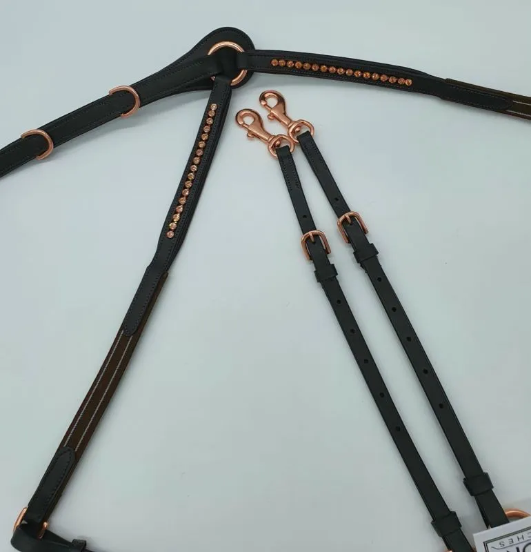 Elastisches V Vorderzeug " DEISTER" Abnehmbares Martingal Befestigung am Sattel mittels Karabiner Seitlich elastisch durch beidseitig Web - Gummis Weich , an der Brust, unterlegt. 2 Extra D Ringe an der Brust. | |||||